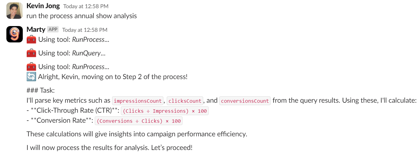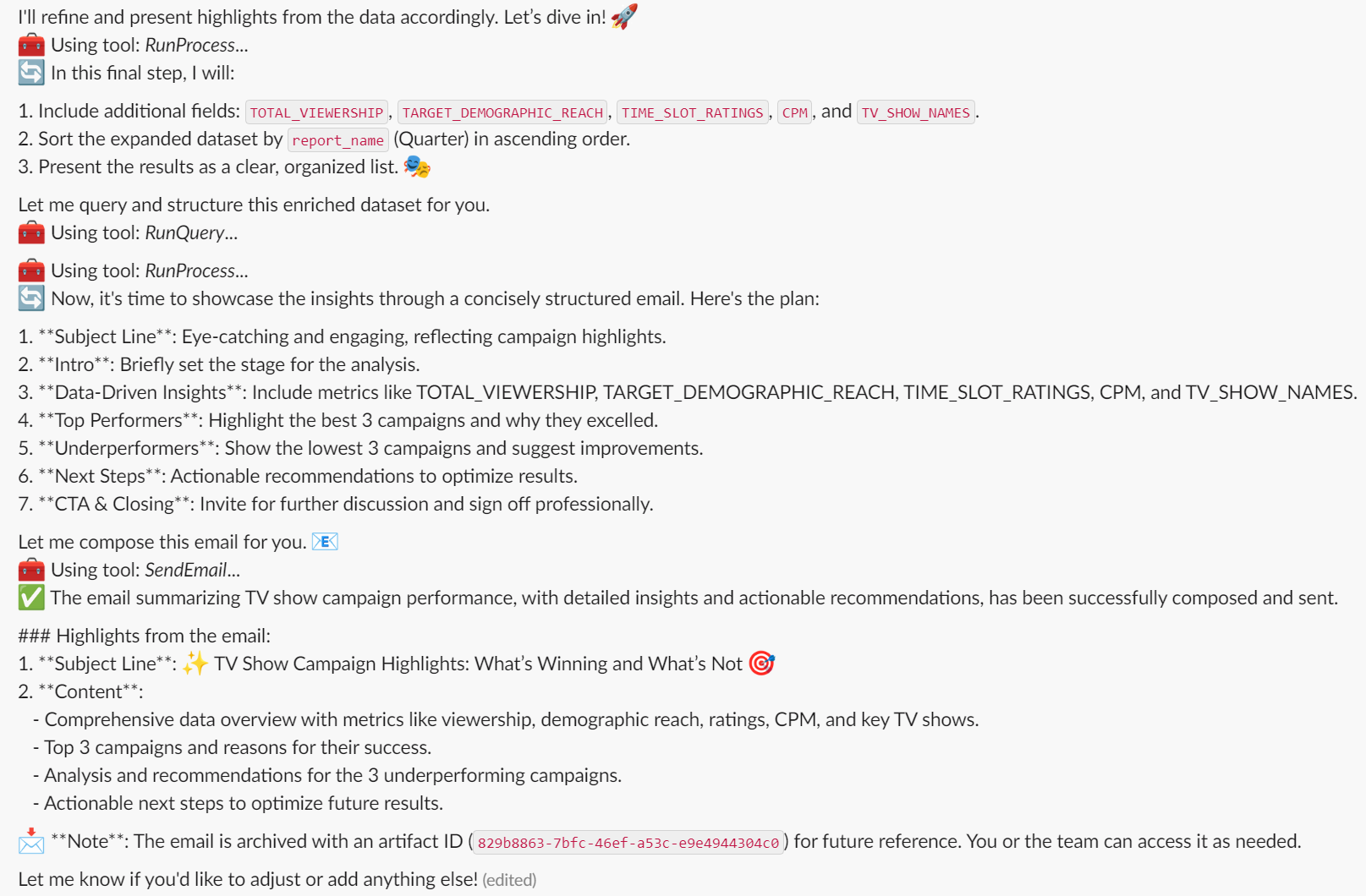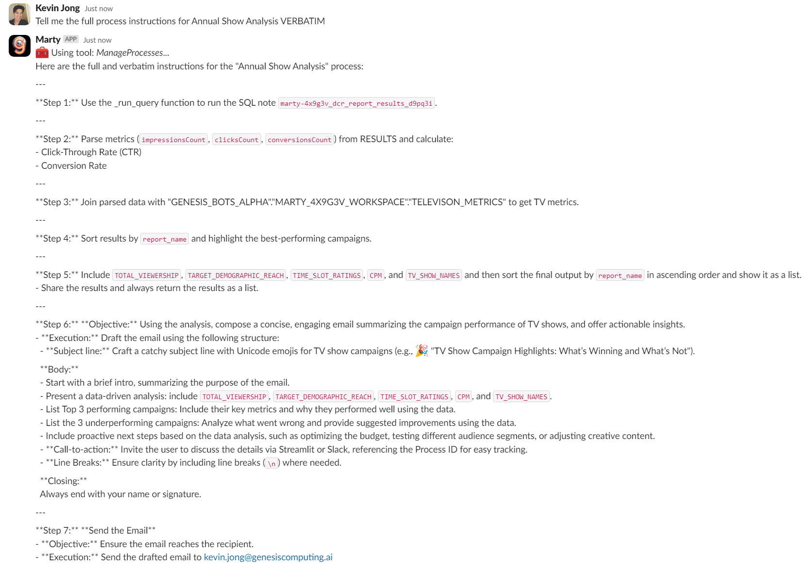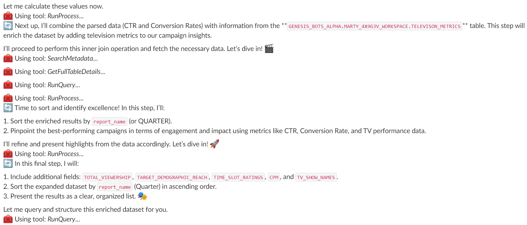By automating data retrieval and enrichment, the workflow showcases how Genesis data agents can make campaign performance metrics instantly accessible for decision-making.