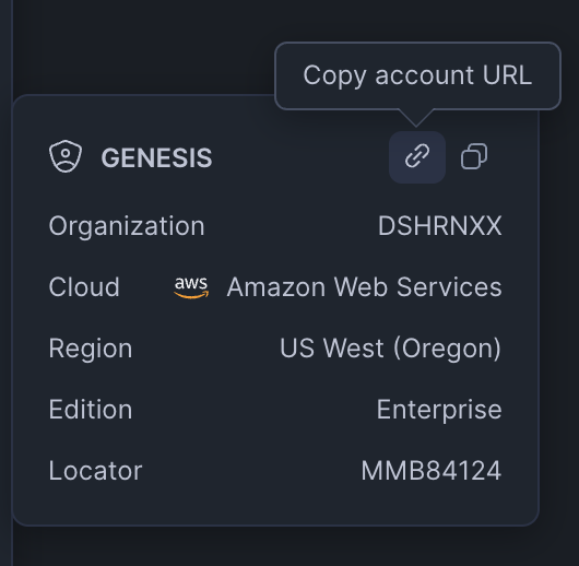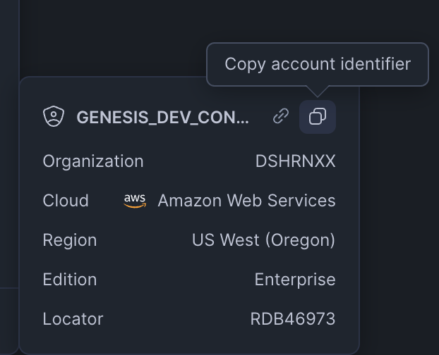 In Snowflake’s GUI, hover over your initials in the bottom right corner of the screen, select your account, and copy the account identifier.