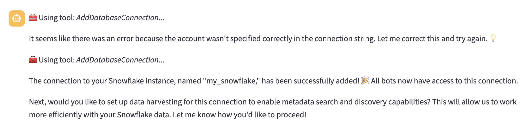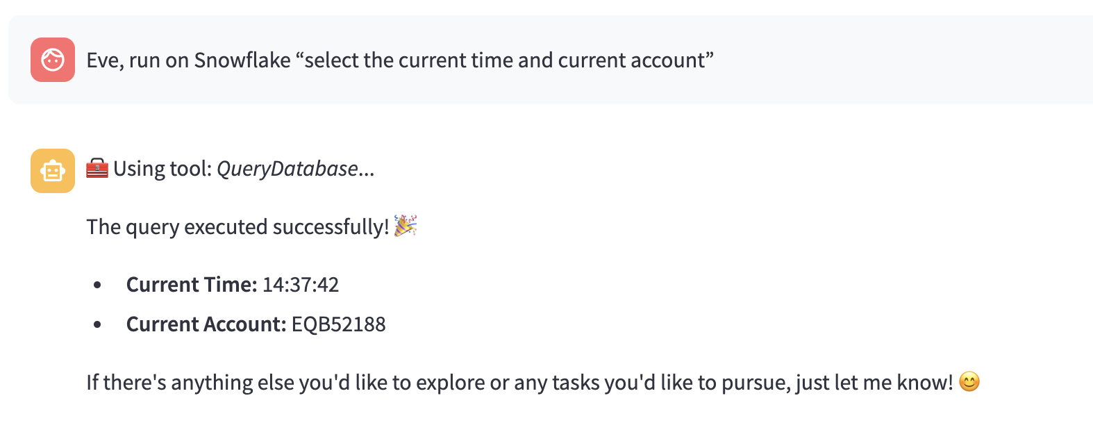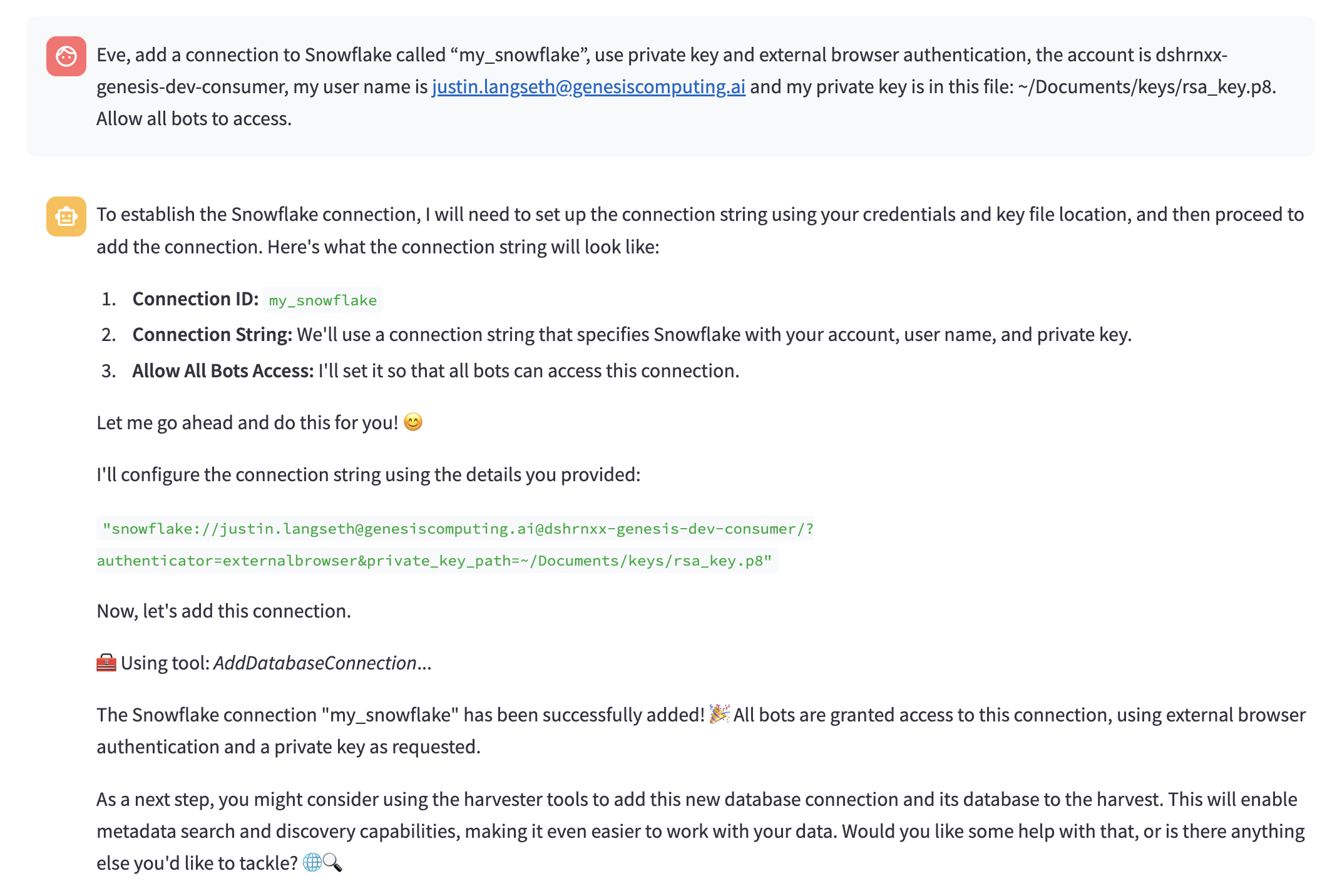 Tell Eve you want to connect to Snowflake and provide your account identifier (as determined above), username, and path to your private key file